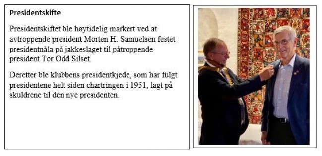 Under klubbens grillaften den 11. august nyttet avtroppende president Morten H. Samuelsen anledningen til å overrekke klubbens pontifikalier til den påtroppende presidenten. Denne høytidelige handlingen var blitt utsatt grunnet pandemien.