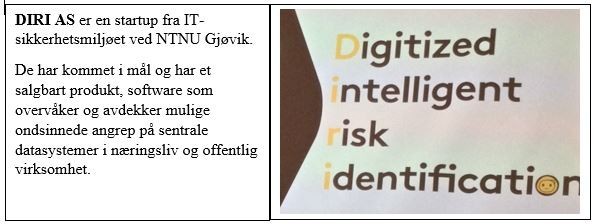 Informasjonssikkerhets-miljøet ved NTNU Gjøvik gir ringvirkninger i form av nye bedrifter. DIRI AS er et slikt selskap som skal forenkle IT-sikkerhetsarbeidet i privat og offentlig sektor. Kanskje kan Gjøvik bli Norges Cybersikkerhets-hovedstad?3-MINUTTER'N: