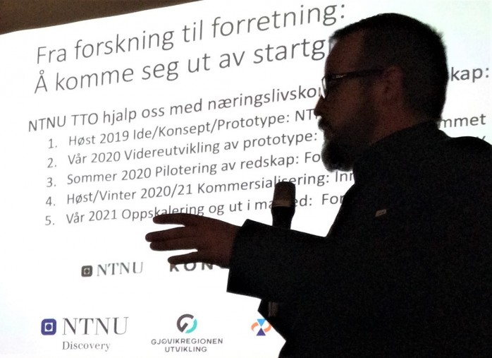 Gaute Wangen viser oss den lange veien de måtte gå før forretning kunne etableres! Den lange og tunge veien med finansiering, kontakt med diverse sponsorer, Gjøvikregionen Utvikling, Forskningsrådet og Innovasjon Norge. Men også den viktige hjelpen de har fått fra NTNU Technology Transfer i Gjøvik som fødselshjelper.
