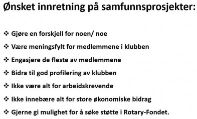 Det er videre ønskelig for klubbens vurderinger at prosjektene skal gjøre en forskjell, føles meningsfylt, engasjere, profilere klubben, ikke ha for store økonomiske uttellinger. Hvis det ytes penger til gode prosjekter, ligger det muligheter for å søke tilskudd fra Rotary D2305. Deler av pengene klubbene bidrar med i kontingent, føres tilbake til slike tiltak.