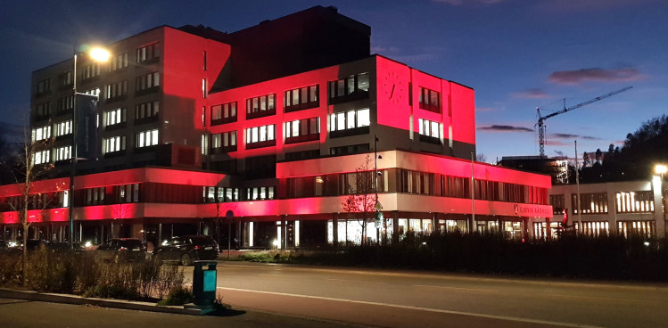 Gjøvik Rådhus badet i rødt lys under aksjonen på verdens poliodag den 24. oktober.
