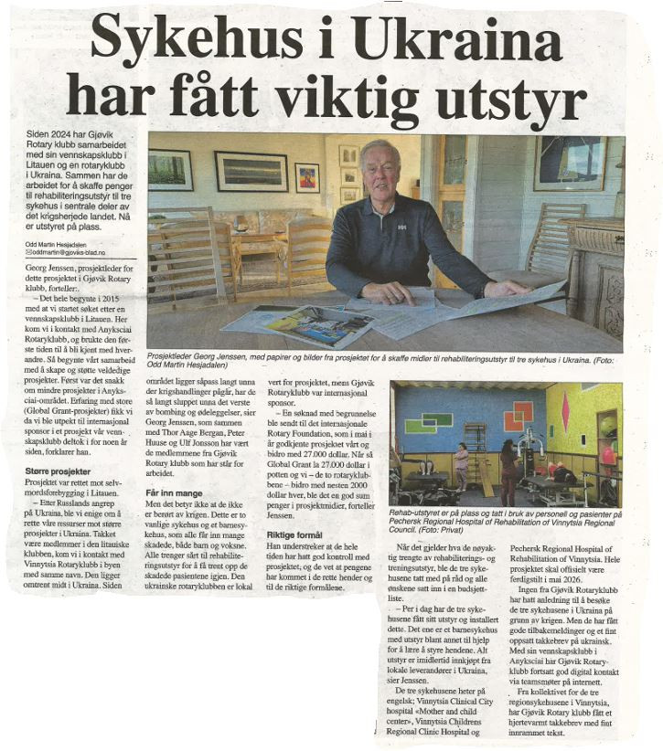 Gjøvik Rotaryklubb har startet et Global Grant prosjekt sammen med vannskapsklubben Anyksciai i Litauen. Mottakere er 3 sykehus i byen Vinnytsia i Ukraina. Vår samarbeidspartener i Ukraina er Rotary Club Vinnytsia Initiative.